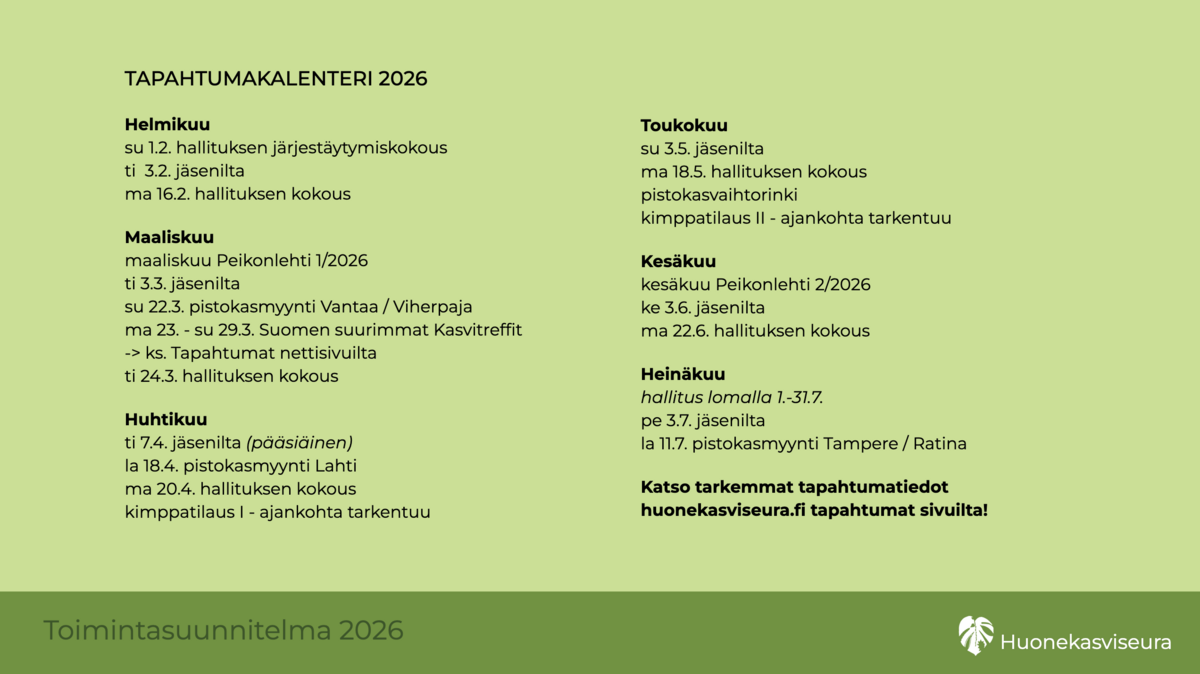 Ollaan varmastikin just viherkasvien hoitopuuhissa, niin ei ole ennätetty päivittää tätä sivua vielä. Tuu käymään joku päivä uudestaan, niin sit täältä voi jo löytyä tietoa...