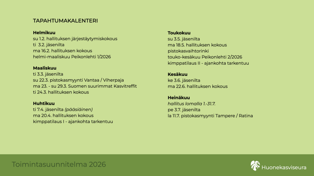 Kokoamme kaikki tulevat tapahtumat toimintakalenteriin nettisivuillemme, joten pidä silmällä osoitetta huonekasviseura.fi – päivitämme kalenteria sitä mukaa, kun suunnitelmat varmistuvat.